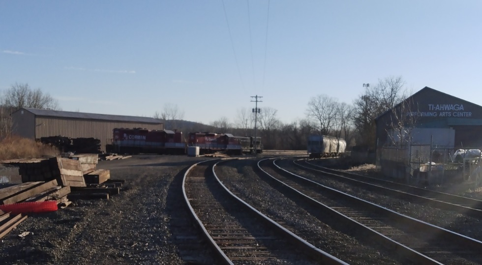 Owego & Hardford RR: Owego, NY Two R Corman geeps are parked by the O&W enginehouse with a rare U23B behind them. Photographed by Chris Bigham, March 27, 2026. Added to the photo archive by Chris Bigham, April 2, 2026. Railroad: Owego & Hartford Railway. » Contact the person who posted this photograph.