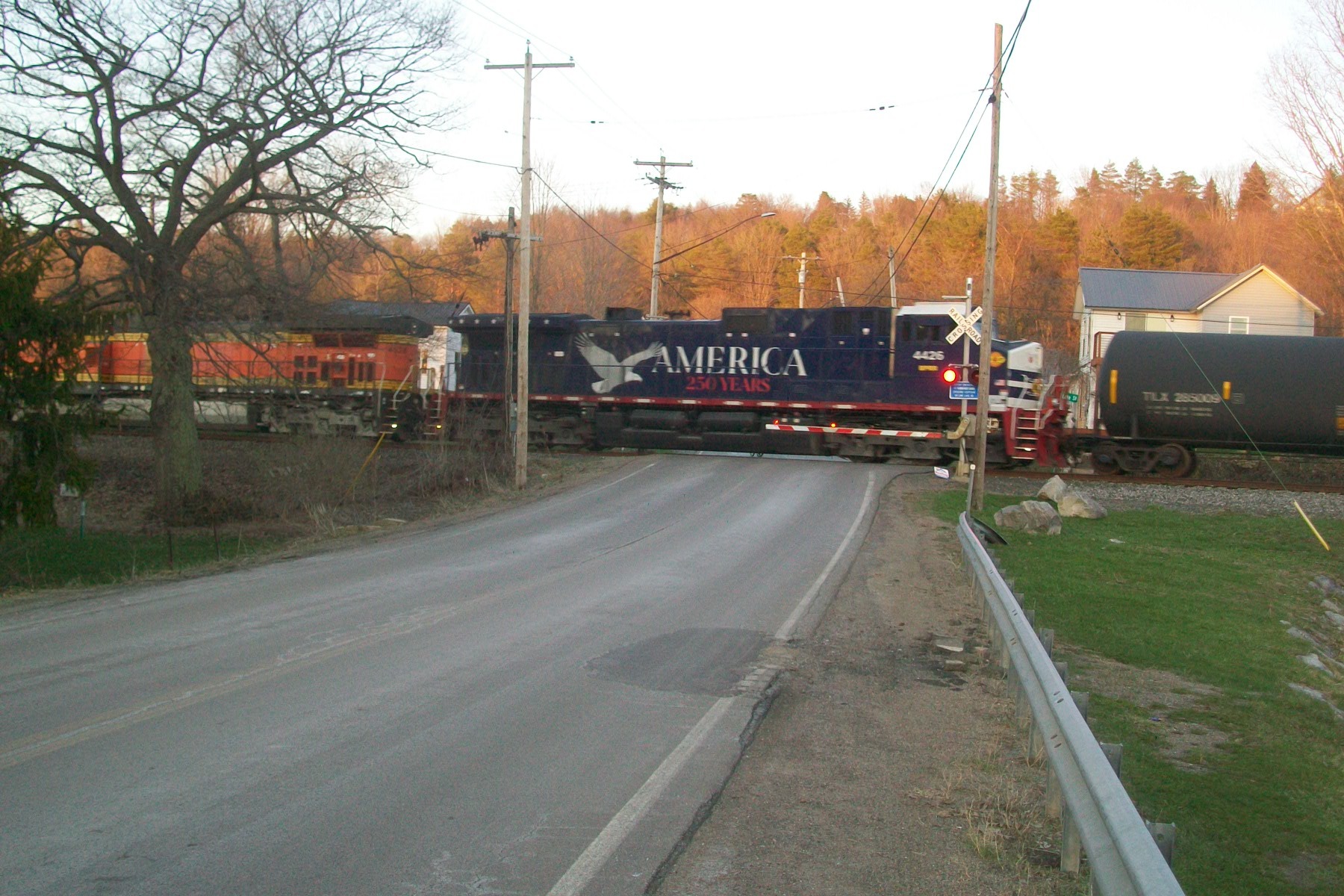 Buffalo & Pittsburgh RR: Lime Lake, NY SIBF crossing Elton Road at Lime Lake.I really like this "250" painted engine. Photographed by Chris Bigham, April 8, 2026. Added to the photo archive by Chris Bigham, April 13, 2026. Railroad: Buffalo & Pittsburgh. » Contact the person who posted this photograph.