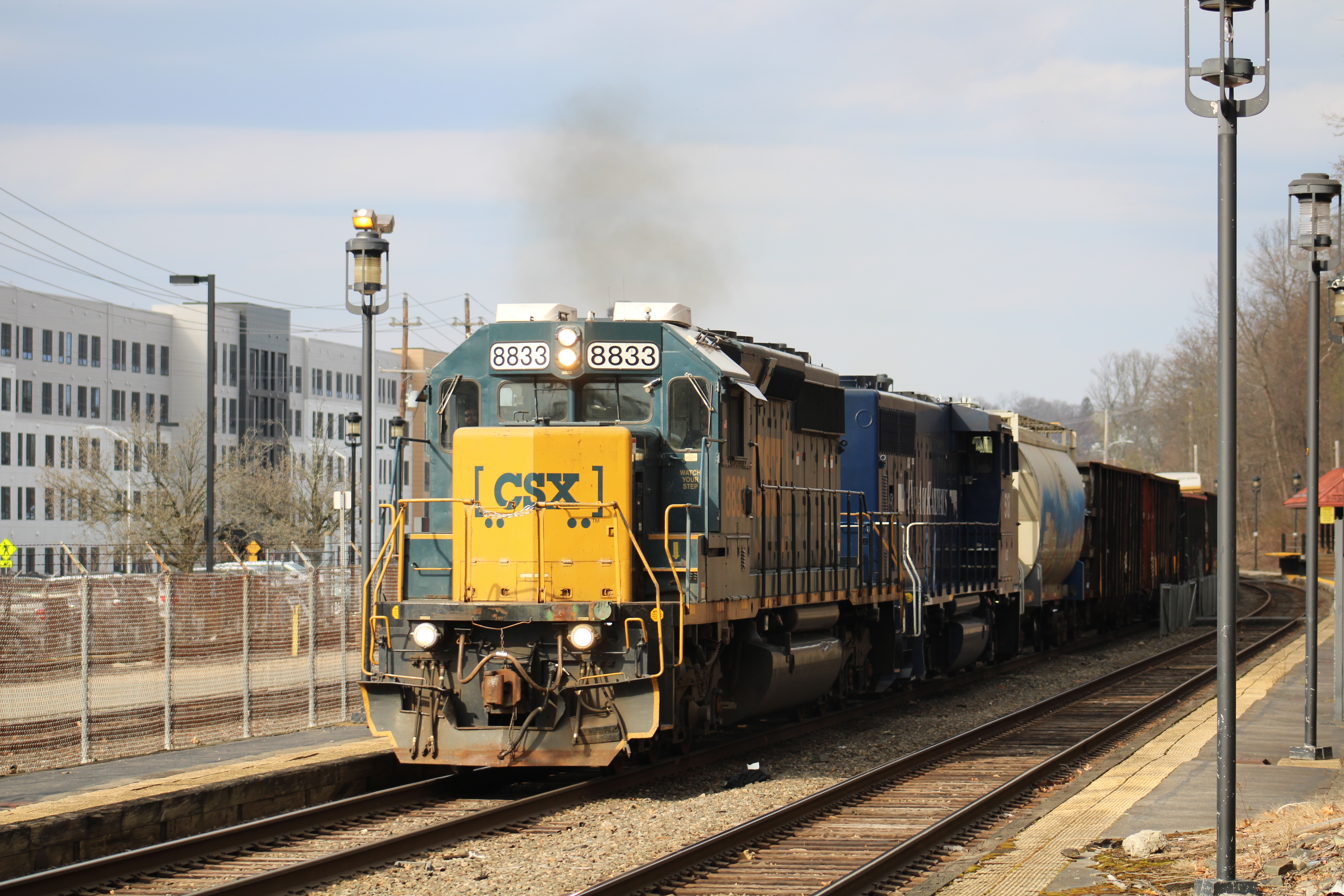 L080-14 westRumbling thru Bradford station in Haverhill MA on track 2 with CSXT 8833-MEC 518 pulling 29 cars headed for Lawrence yard