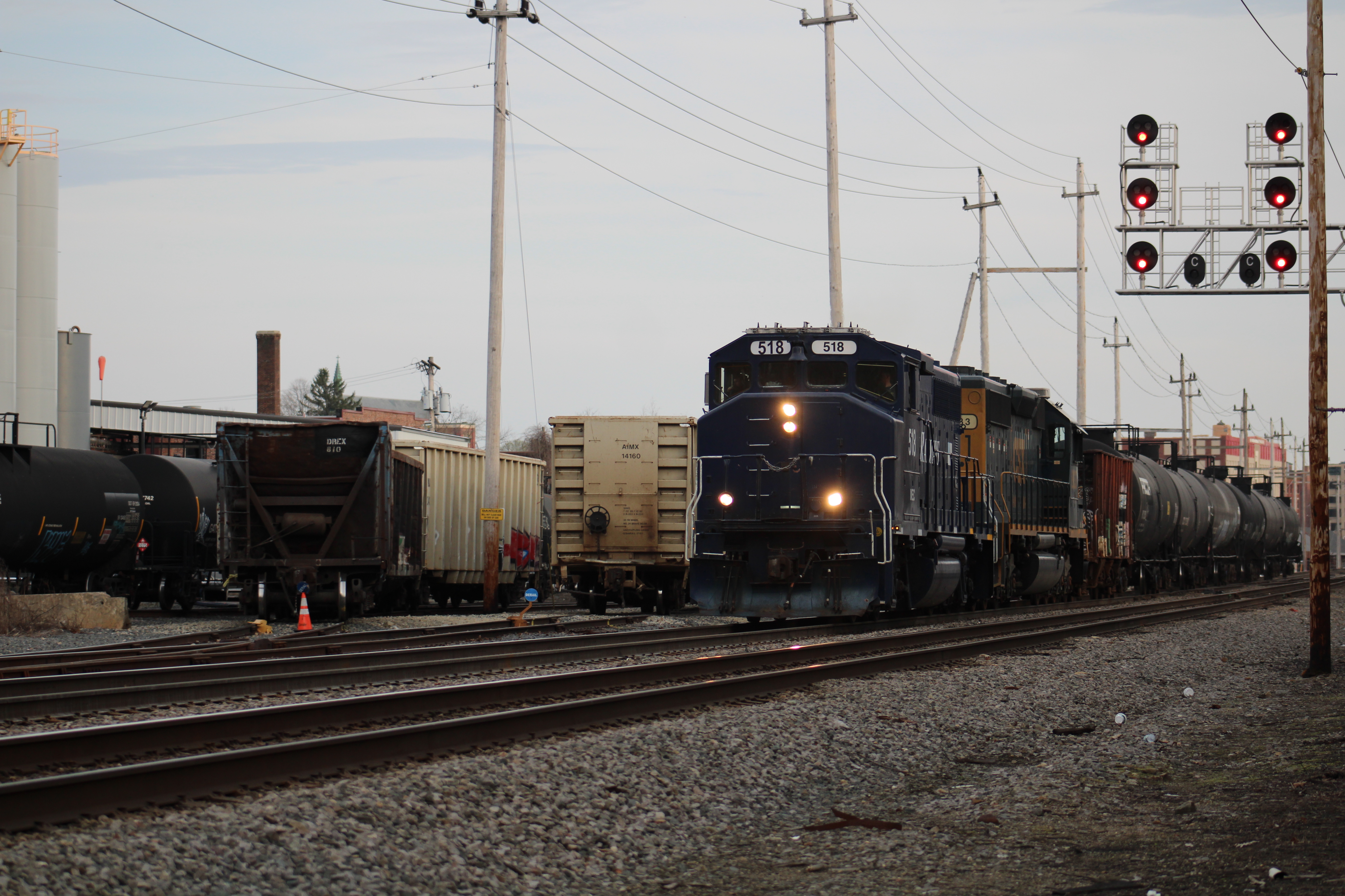 L080-14 eastRolling east thru CPF-HA in Haverhill MA on track 1 with MEC 518-CSXT 8833 and 7 cars. Glad to see 518 back in service.