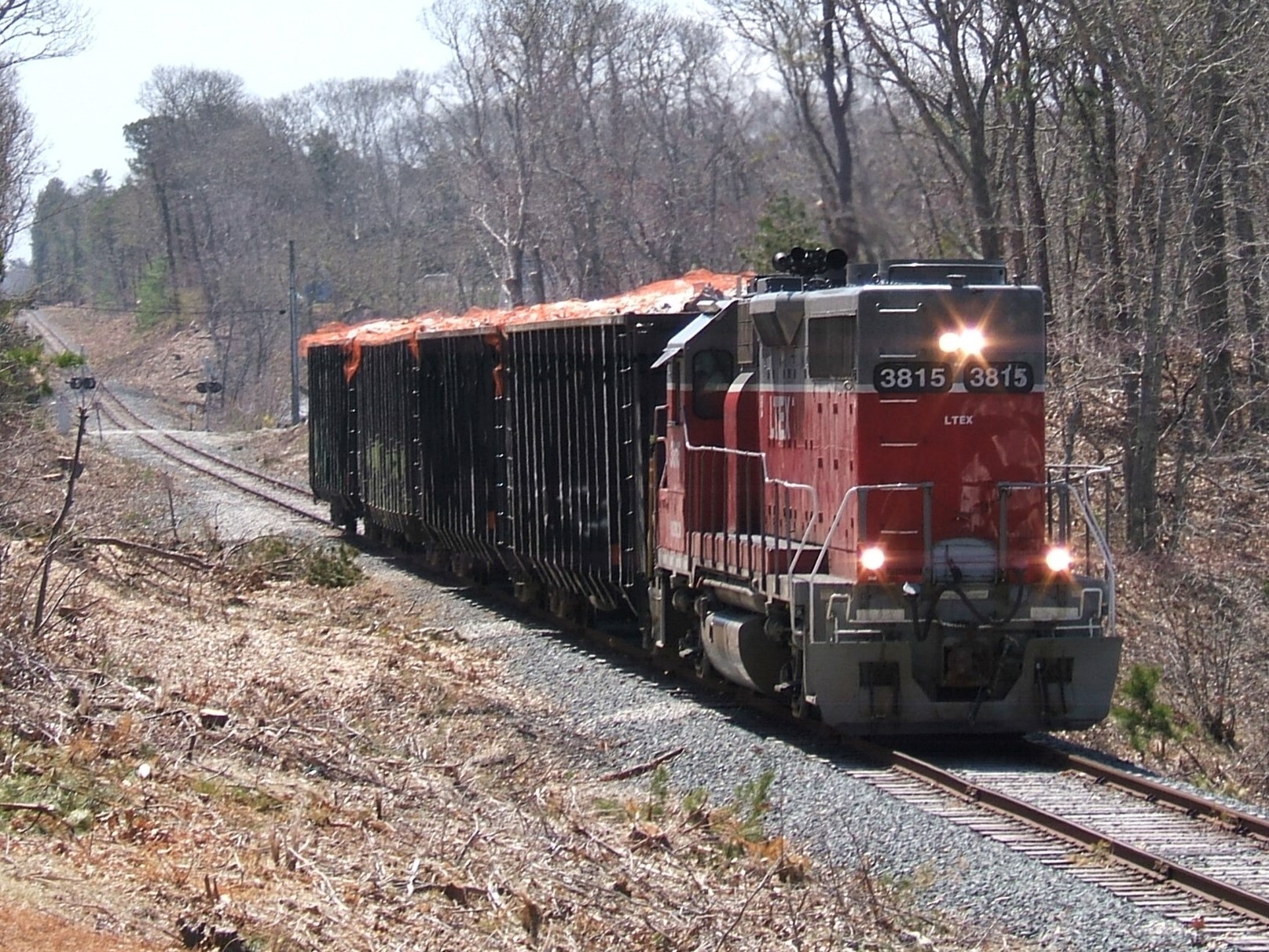 Mass Coastal LTEX 3815 on the Falmouth SecondaryMass Coastal LTEX 3815 with C/D cars in tow from the Upper Cape Regional Transfer station. Shown approaching the Shore Road underpass bridge at MP 4.58 by Kingman's Marina in Cataumet MA