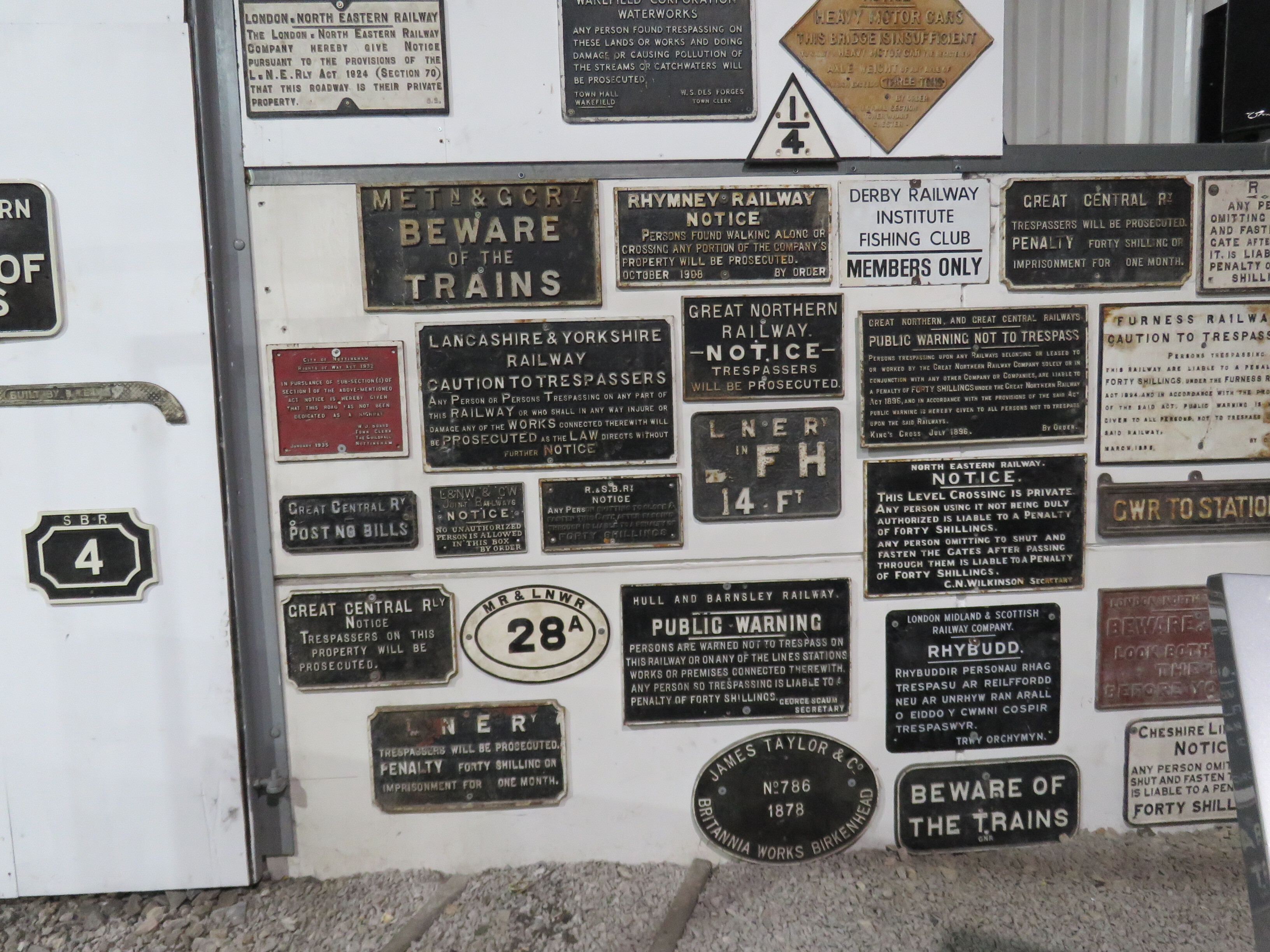 A collection of old railway signsInside the narrow gauge roundhouse at Statfold Barn Leisure Park.